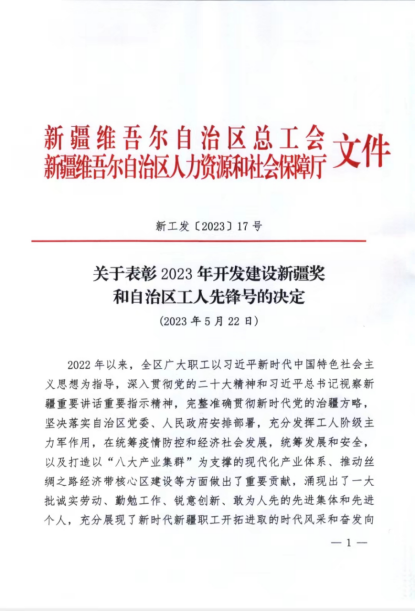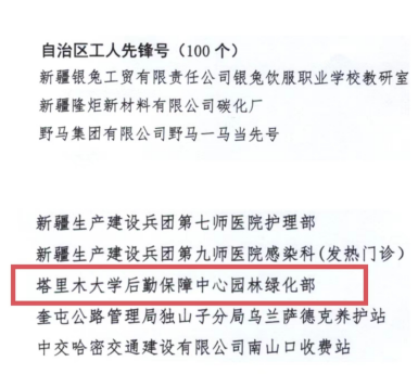 为表彰先进、树立榜样,进一步增强新时代工人阶级的自豪感和使命感,营造劳动光荣的社会风尚和精益求精的敬业风气,凝聚起推进中国式现代化新疆篇章的磅礴力量,近日,自治区总工会、自治区人社厅决定授予100个集体自治区工人先锋号。我校后勤保障中心园林绿化部荣获“自治区工人先锋号”。