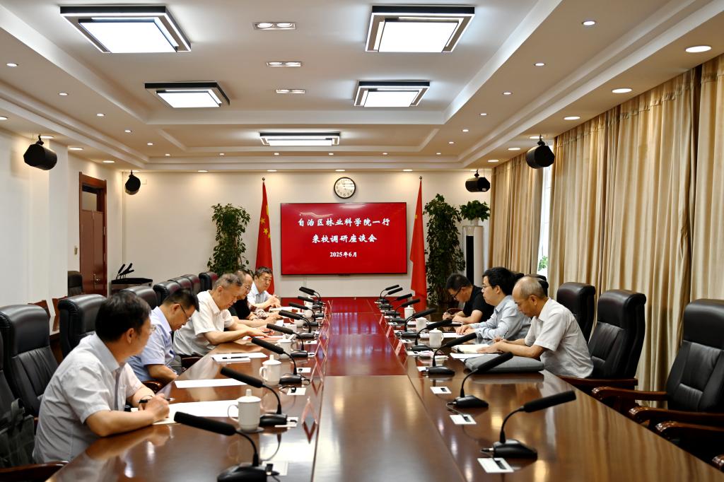 6月17日,自治区林业科学院党委副书记、院长陆海一行来校调研,与我校党委副书记于军等领导座谈交流。