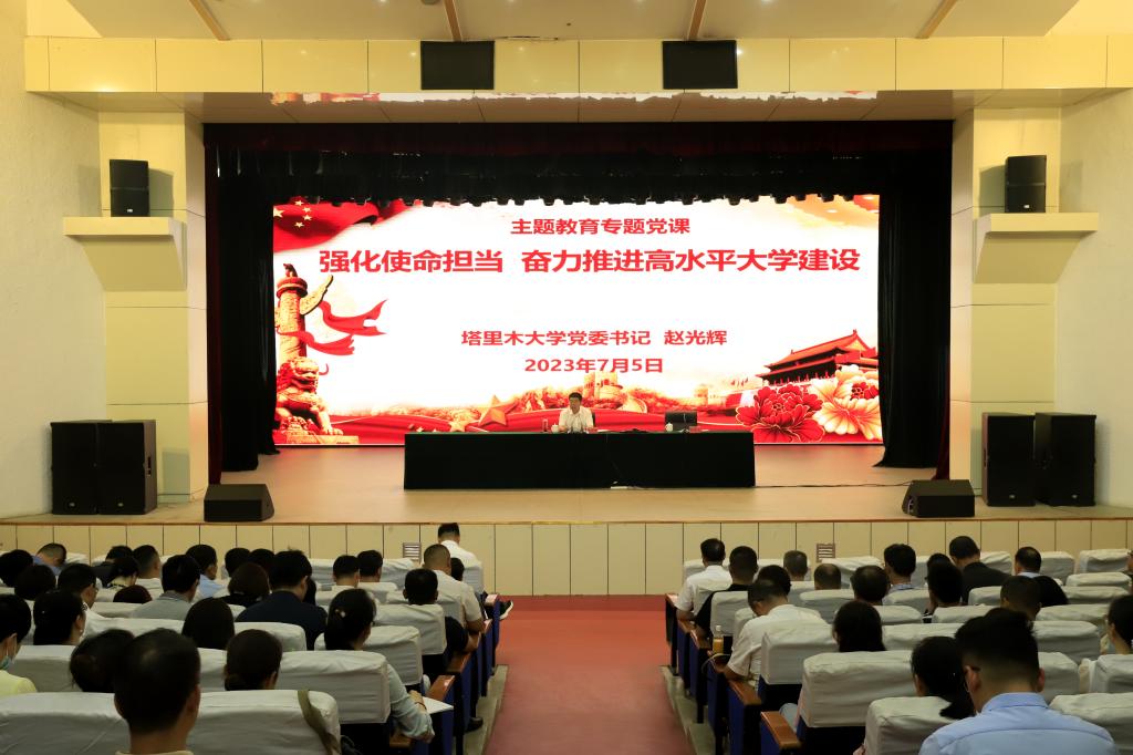 赵光辉首先传达学习了李邑飞同志为兵团机关部门、直属机构和有关国有企业党员干部讲授学习贯彻习近平新时代中国特色社会主义思想主题教育专题党课的主要内容。他围绕开云app体育网页登录不上 建校以来的“三个不平凡”;新时期党和国家赋予塔大的光荣使命和重大任务;五年来锐意进取、攻坚克难,取得的历史性成就;新征程上塔大面临的新机遇和新挑战;继续发扬胡杨精神,为实现兵团特点、南疆特色一流大学而奋斗这五个方面进行了全面深入的讲解。