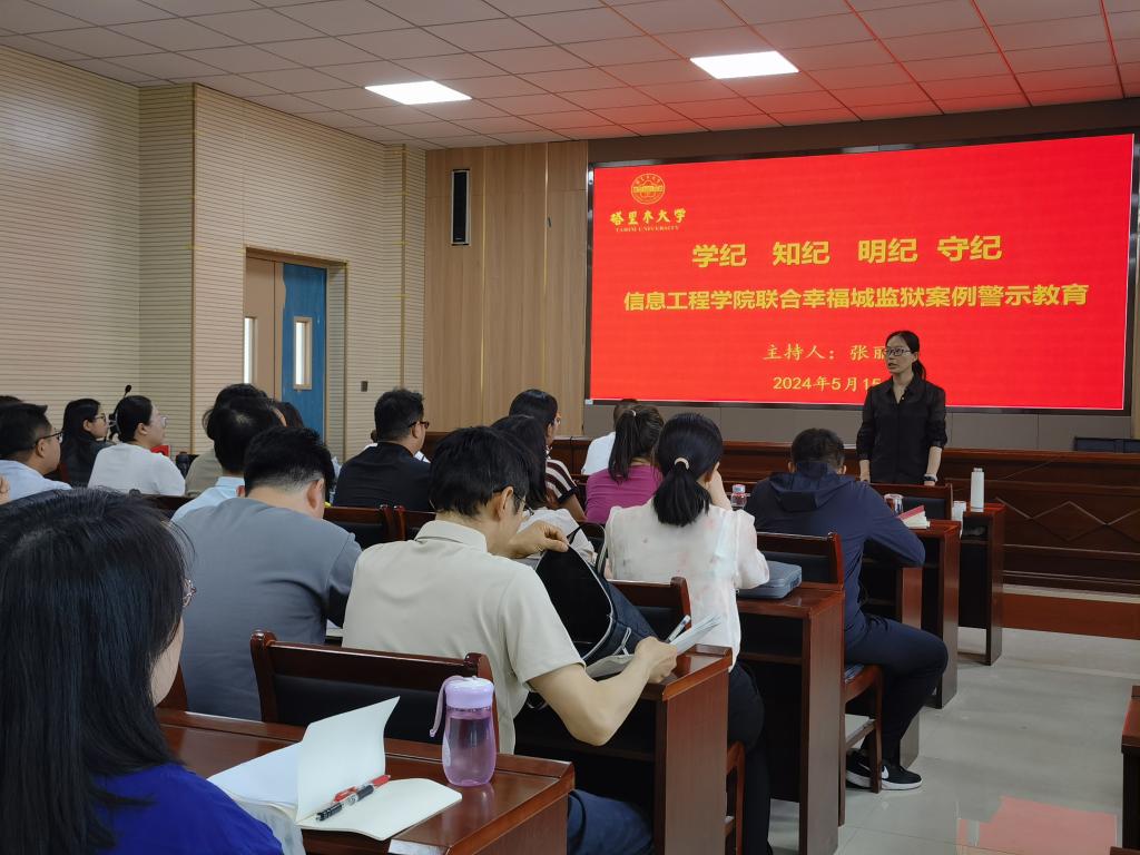 为深入开展党纪学习教育,引导党员干部学纪、知纪、明纪、守纪,不断增强纪律意识和拒腐防变能力,5月15日下午,信息工程学院联合阿拉尔市幸福城监狱开展“观案学纪”案例警示教育活动。全体在校学院领导班子成员、学院全体党员教师参加。
