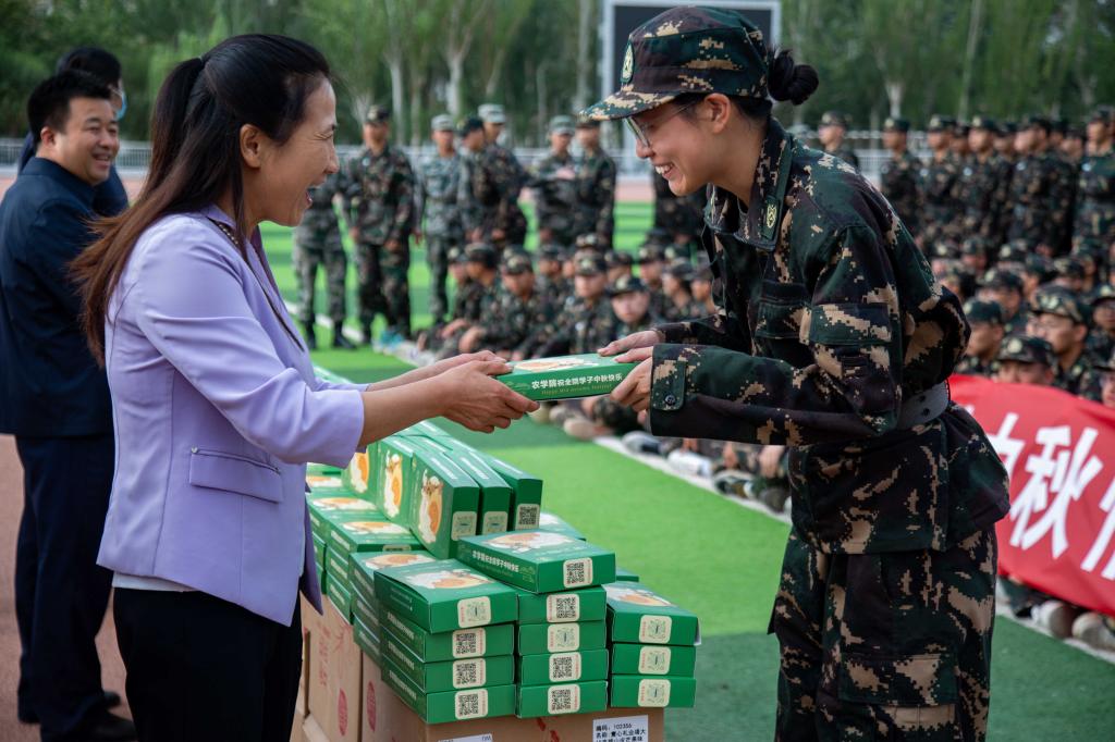活动在清晨的阳光下如期进行。农学院党委书记、院长万素梅、副院长翟云龙,学院全体辅导员老师及军训教官共同参与了此次发放仪式。在简短的致辞中,万素梅对新生们在军训中的辛勤付出表示赞许,各位老师将印有“农学院祝全院学子中秋快乐”祝福语的精美月饼一一发放到新生们的手中。