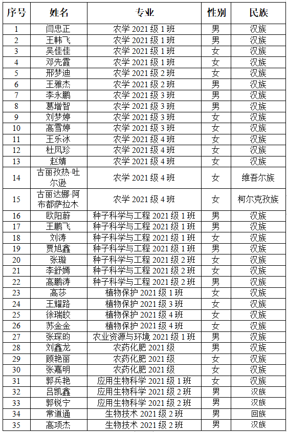 根据学生自愿申请,本着公正、公平、公开的原则,经初选,学院评审小组面试评审,拟定闫忠正等35人为第八届棉花实验班学生,具体名单如下: