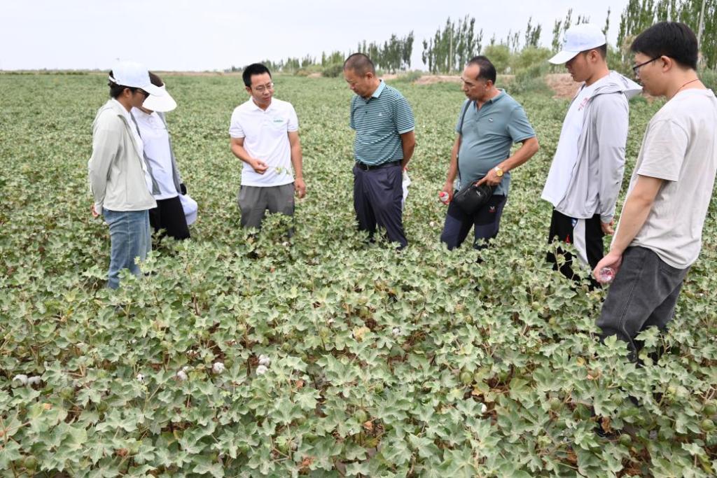 团队针对棉花种植中的病虫害防控、高产栽培等关键技术进行实地指导,通过向棉农提出“预防为主、物化协同、科学防治”等现代科技手段,在当地村委会协助下,指导棉农学习棉花花铃期的栽培管理技术。