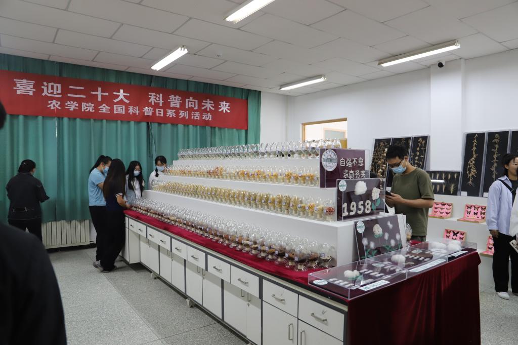 南疆作物遗传改良与栽培重点实验室标本室内,陈列了不同品种的棉花、小麦、大豆、高粱等种子和同学们精心制作的标本作品。在观展过程中,可以近距离接触一些珍稀品种,生动形象的标本能让我们更加直观地感受昆虫,栩栩如生的精美标本也更能激起对昆虫的兴趣,领略大自然的灵性。师生充分领略了作物种质资源作为生物资源的重要组成部分,是培育作物优质、高产、抗病、抗逆新品种的物质基础。