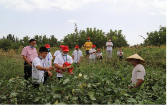 7月26号,普查团再出征,来到十二团托喀依乡三队。今日团队选择深入田间地头。观察目前团场农户种植模式及种植现状。刚下车团队在路边发现一名农户在棉花地里除草。马银虎老师走上前,现场授课,告诉农户棉花种植过程中如何防止并根除杂草。农户亚库普对此深表感谢,他说:“我们这个棉花嘛草多的很,头疼的不行嘛,要不是你们这些专家我们亏得很”。紧接着观看化学打定后试验田,队员郭富成同学讲,化学打定已经深入到各个角落,这个是未来发展一大趋势,我们要紧跟时代,学习化学打顶技术,及时为农业发展献出自己的青春之力。