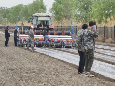 棉花播种机正在大田缓缓前行,铺设地膜、滴灌带、精量播种等环节在北斗卫星导航的精准定位下完成。