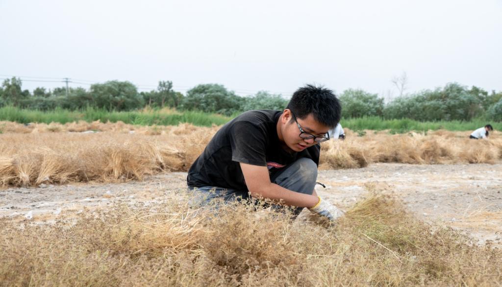 劳动竞赛是农学系实践教学的亮点活动,6月26日,农学系带领2020级农学和种子科学与工程班级90名学生到东区胡杨林试验基地开展孜然收获比赛。