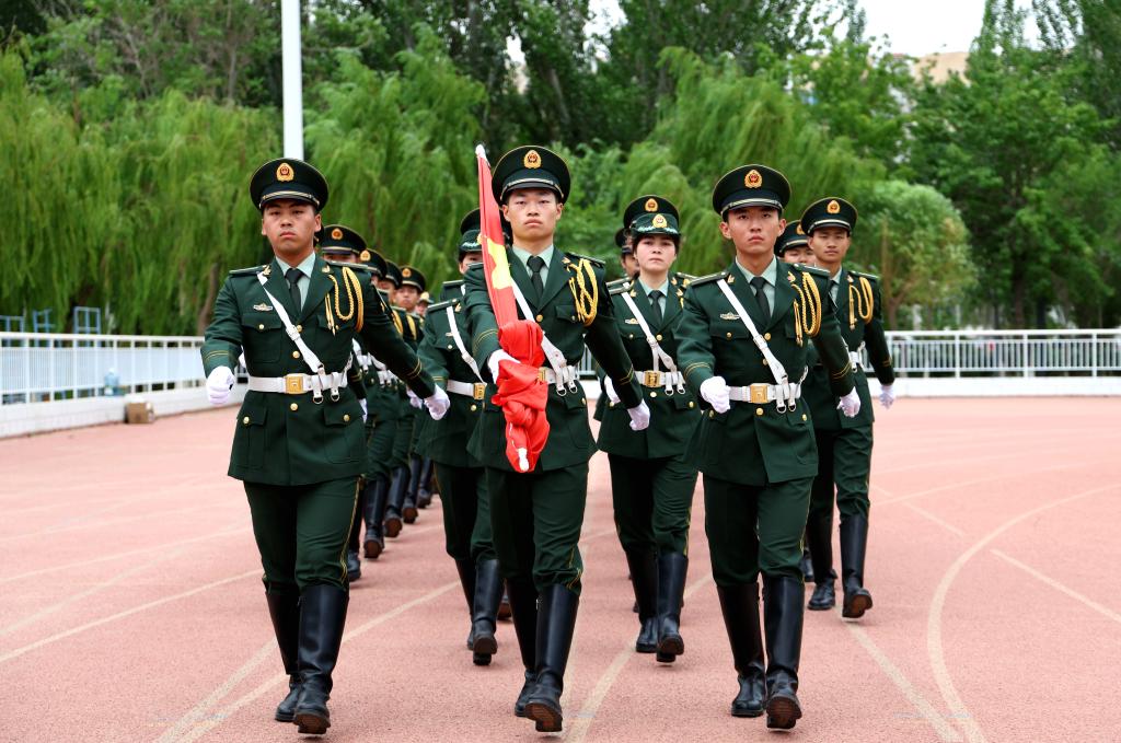 上午9时,国旗护卫队迎着朝阳,踏着整齐的步伐,护送国旗入场。